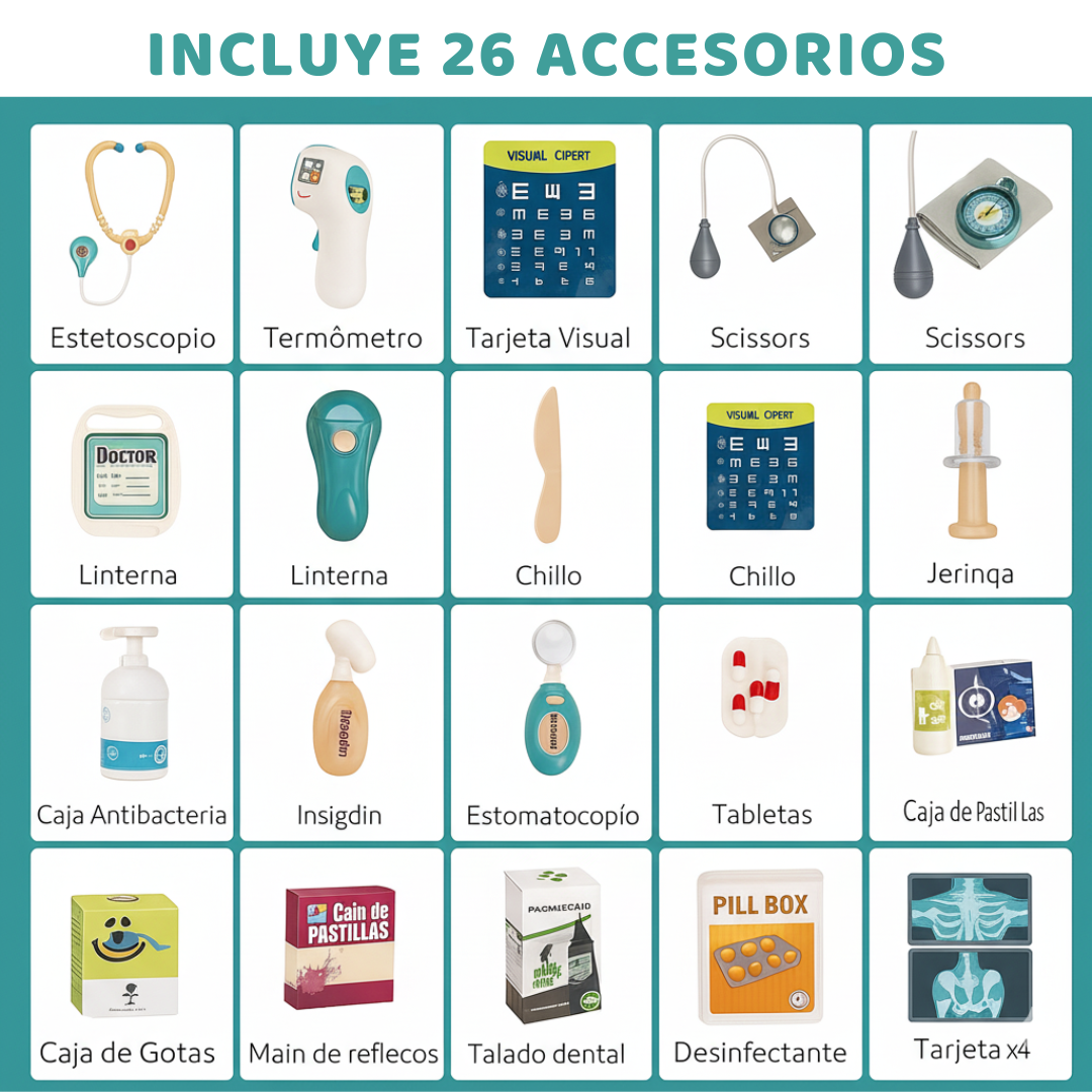 Incluye estetoscopio, jeringa, tijeras, monitor cardiaco con luz, termómetro, frascos simulados y más. Todo organizado en un coche médico grande y estable: